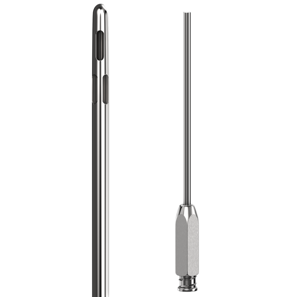 This cannula is offered in a selection of diameters and lengths, enabling surgeons to choose the size that best accommodates their requirements. Moreover, the cannula can be curved up to 40 degrees for enhanced maneuverability and access to hard-to-reach spots. Furthermore, the item is manufactured in the United States and is autoclavable for effortless cleaning and sterilization.