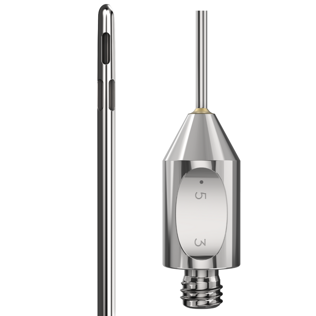 The Las Vegas cannula has two lower radial ports and one central port near the tip of the cannula, making it perfect for liposuction procedures where medium portions of fat removal is required. The rounded tip assists in minimizing damage to surrounding tissue without sacrificing penetration depth. It is notable for its lightness and conventional design, and the Lotus contour handle offers a superior grip while remaining aesthetically pleasing.