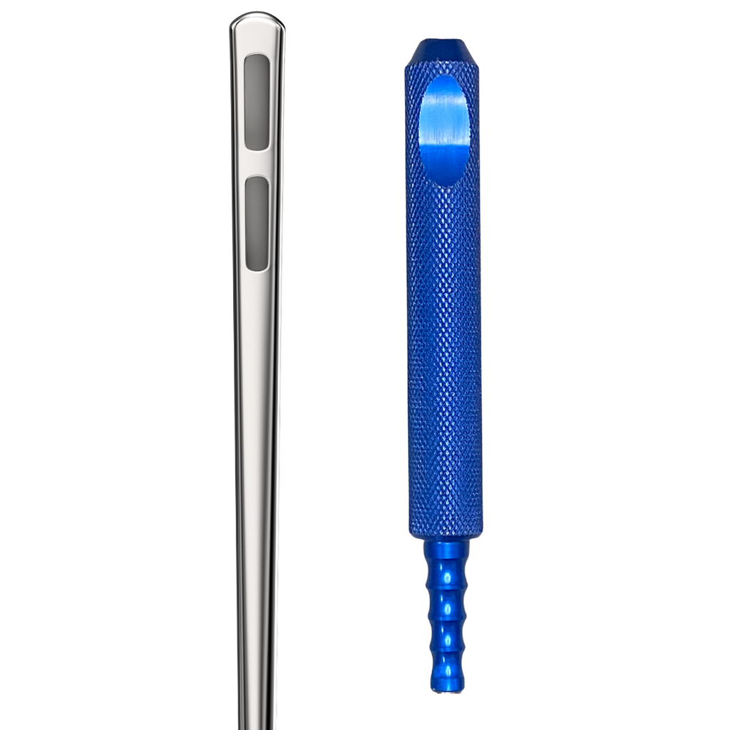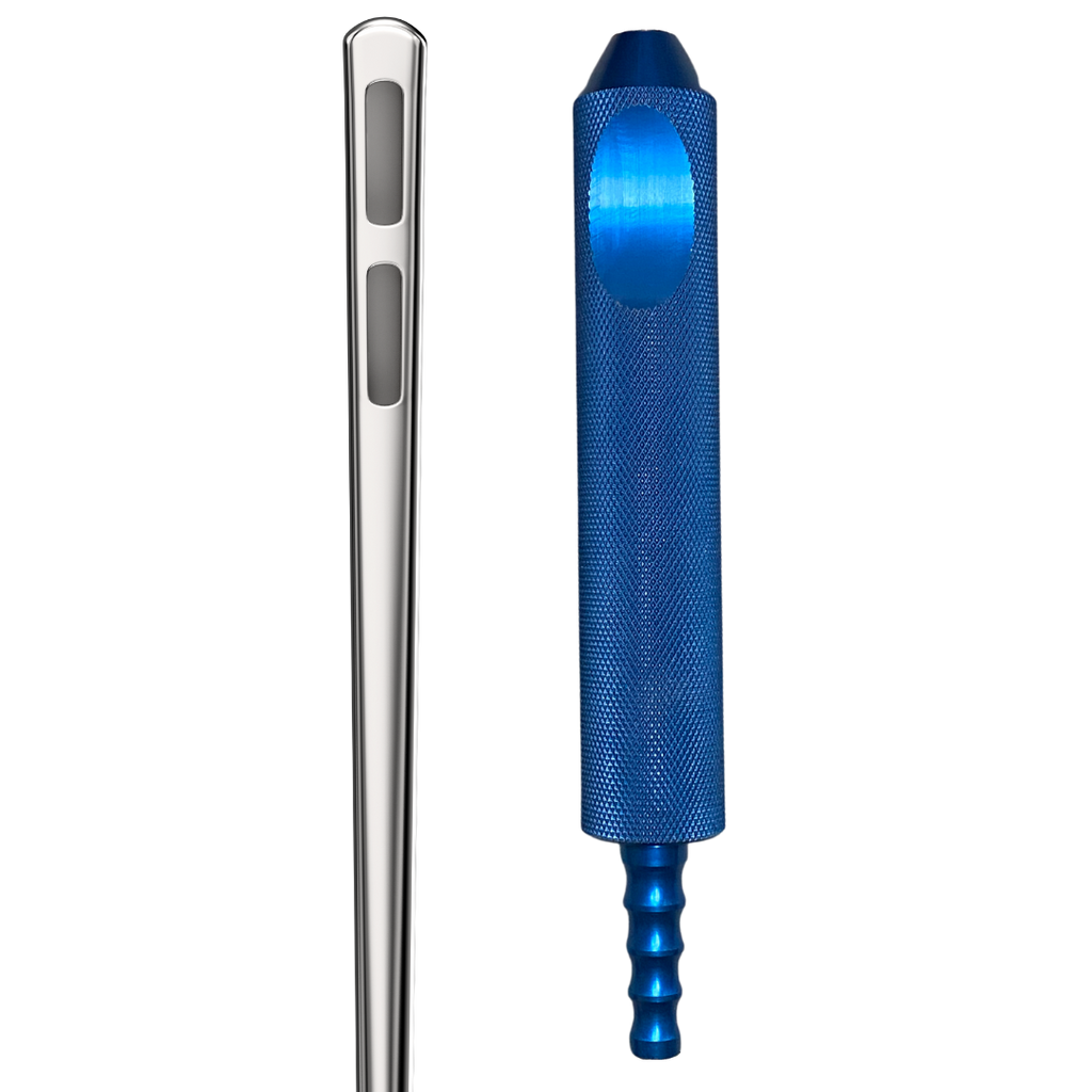Our Lotus grey contour aluminum handle or knurled blue aluminum handle option is available in either a 1" or 3/4" diameter. Moreover, this cannula is also offered with a large luer lock stainless steel hexagon hub ensuring enhanced disconnection and attachment to the syringe or handle.