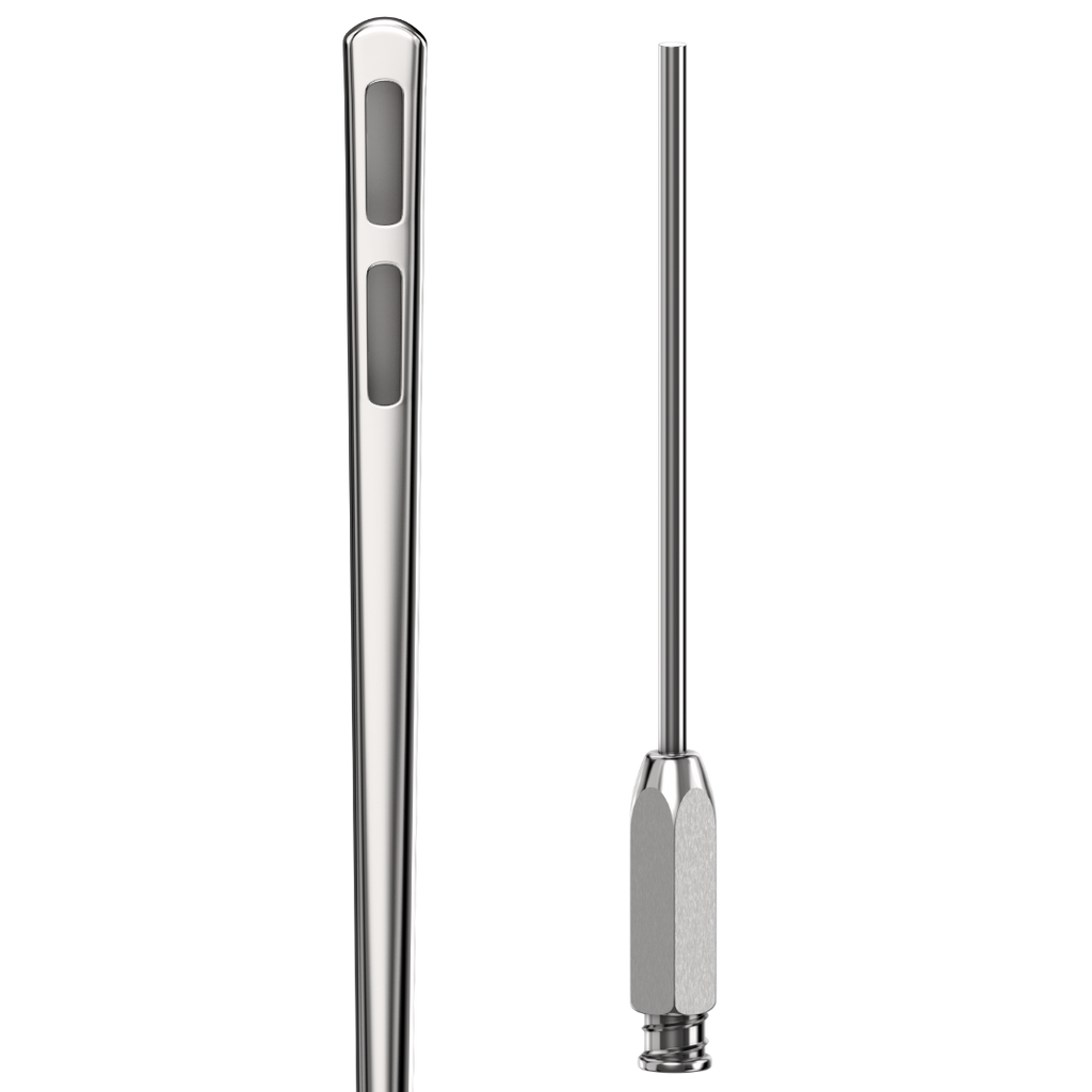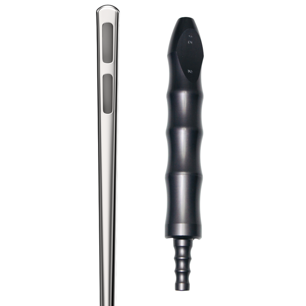 The Spatula Double High Port cannula is used for facial, arm and neck procedures. The ports are closer to the tip of the cannula allowing for additional reach when performing liposuction procedures, where every millimeter counts. The spatula cannula can also be utilized for more delicate operations, such as skin regeneration or wrinkle diminution.