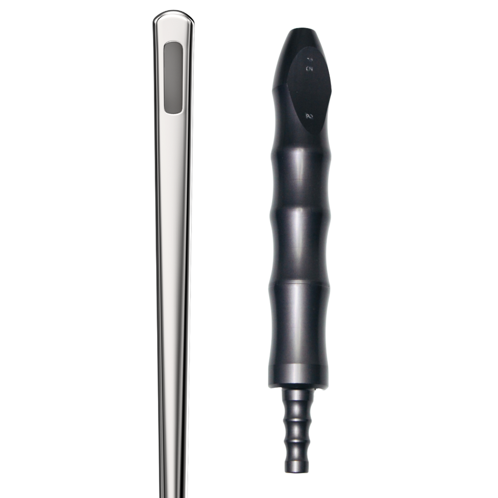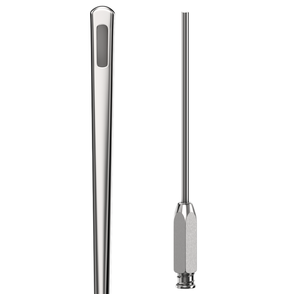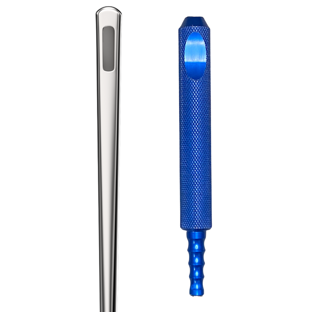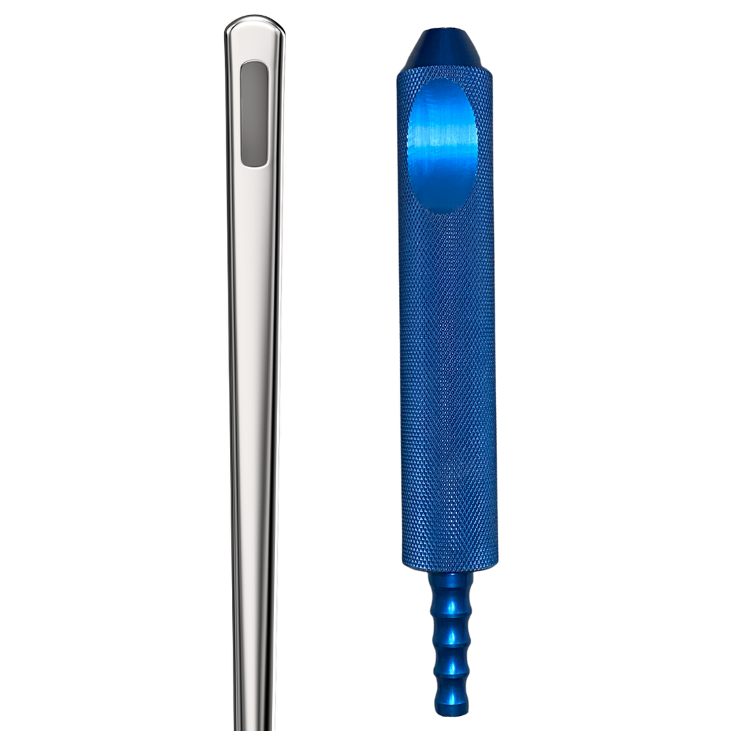 Our Lotus grey contour aluminum handle or knurled blue aluminum handle option is available in either a 1" or 3/4" diameter. Moreover, this cannula is also offered with a large luer lock stainless steel hexagon hub ensuring enhanced disconnection and attachment to the syringe or handle.