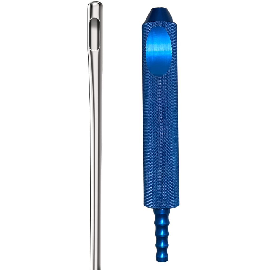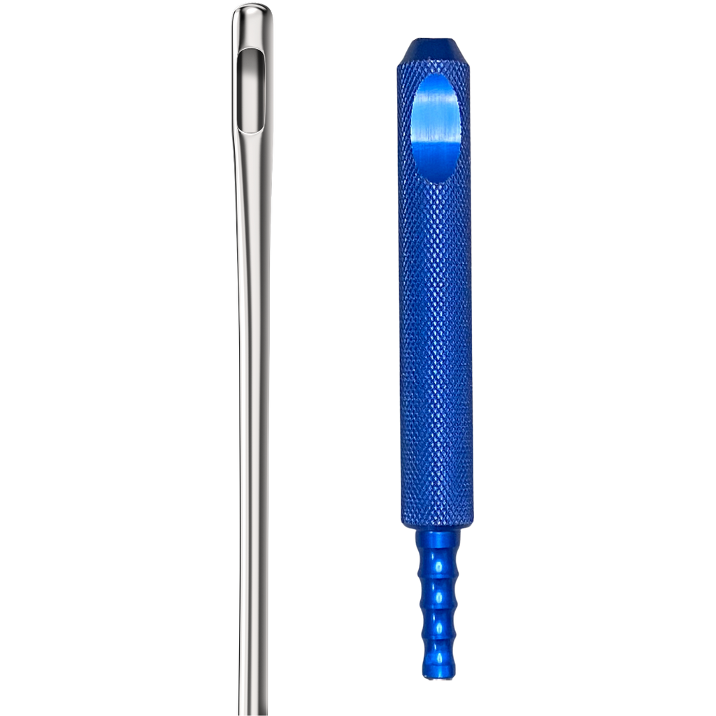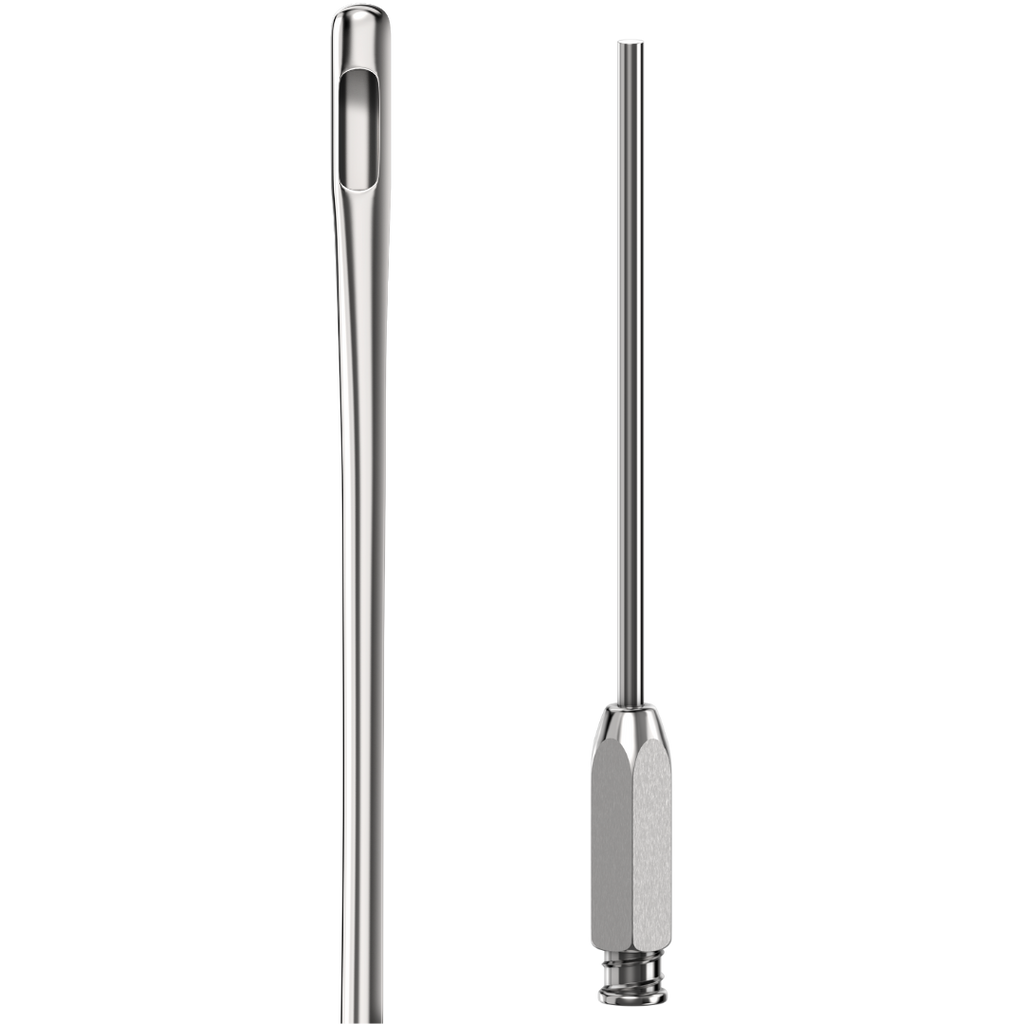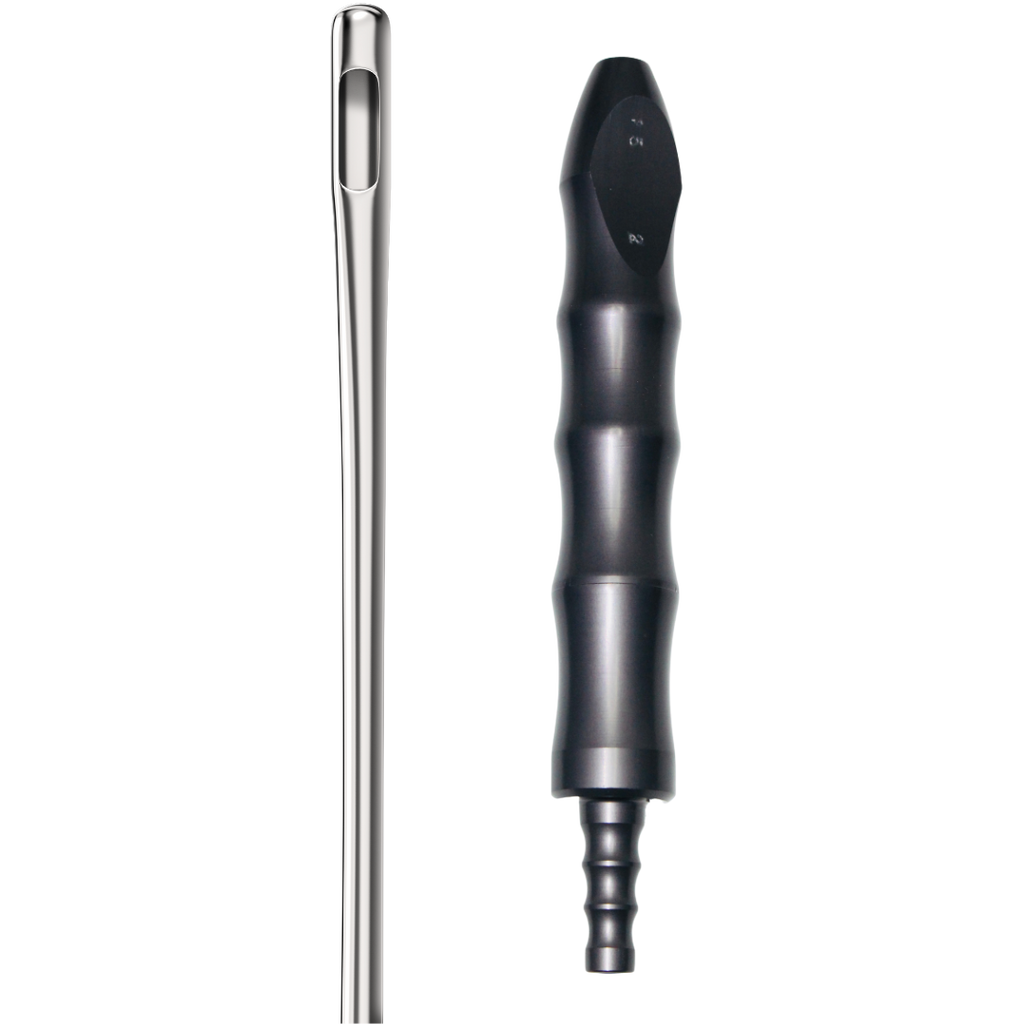Choose between our Lotus grey contour aluminum handle or knurled blue aluminum handle options, available in either a 1" or 3/4" diameter. The spatula cannula also comes with a large luer lock stainless steel hexagon hub, which ensures enhanced disconnection and attachment to the syringe or handle.