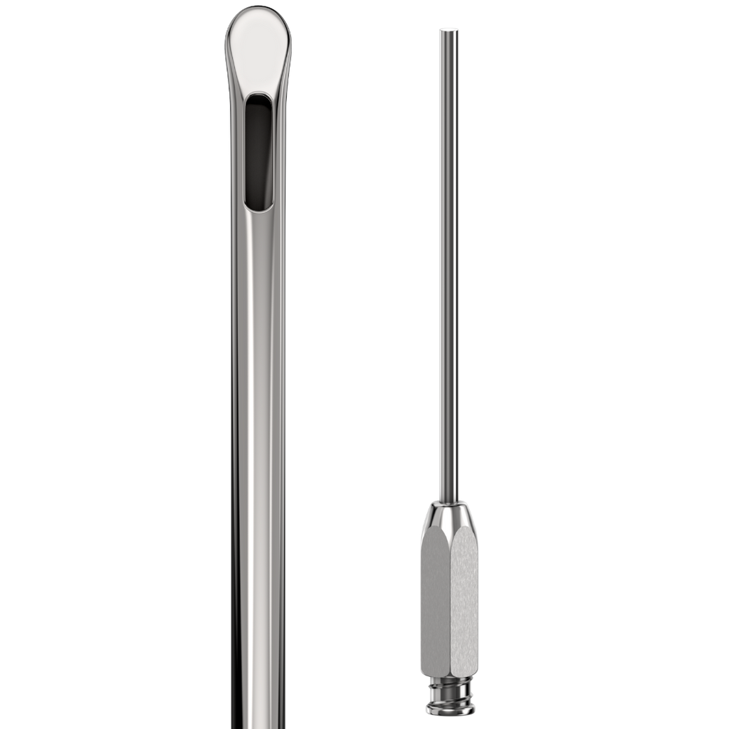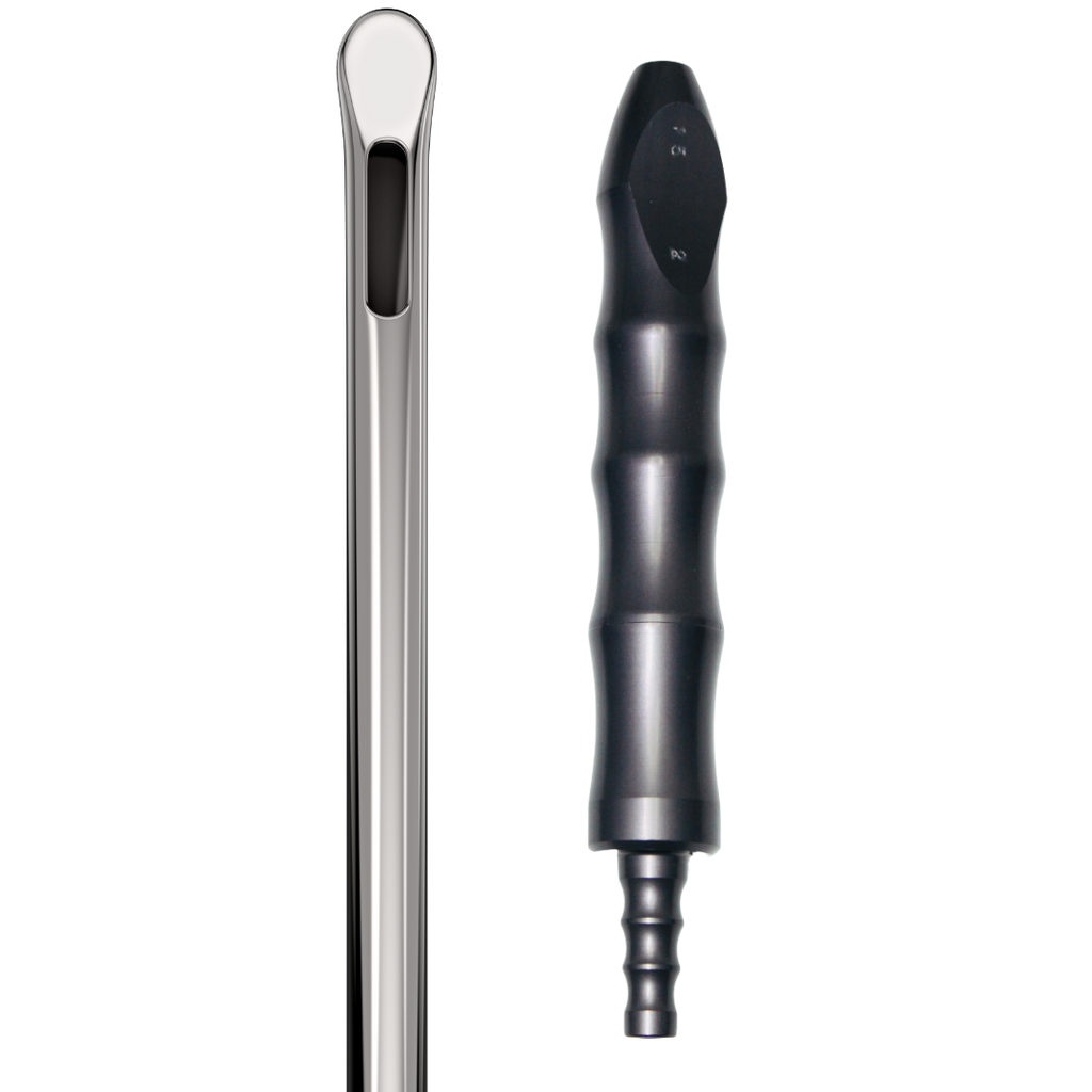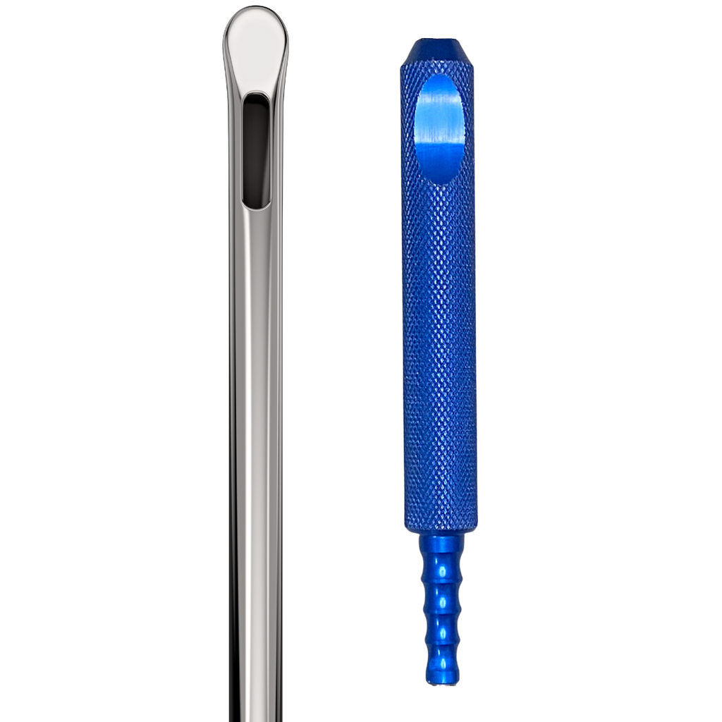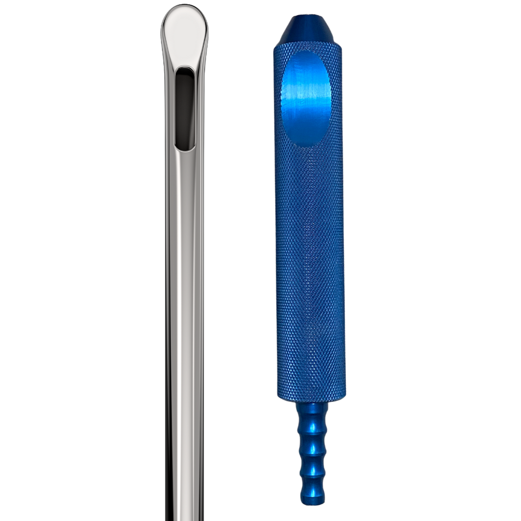 Our Lotus grey contour aluminum handle or knurled blue aluminum handle option is available in either a 1" or 3/4" diameter. Moreover, this cannula is also offered with a large luer lock stainless steel hexagon hub ensuring enhanced disconnection and attachment to the syringe or handle.