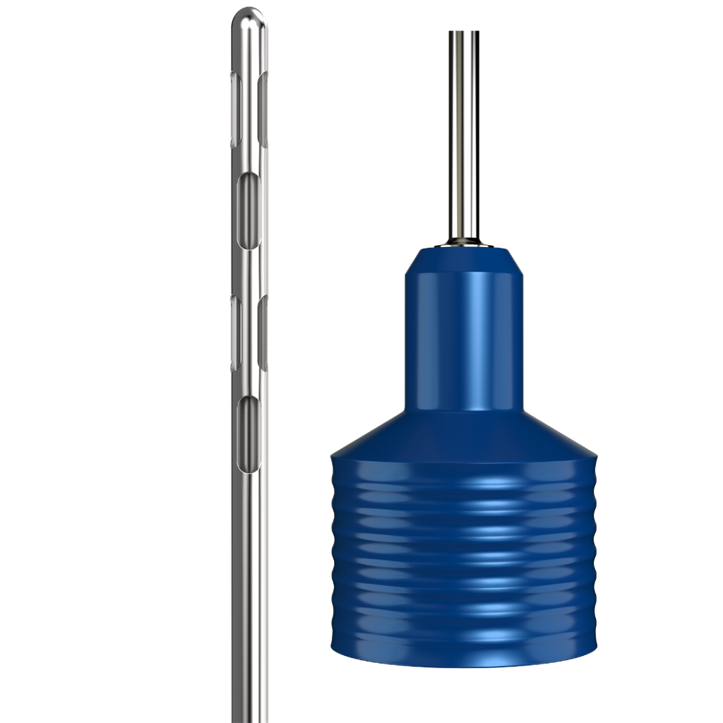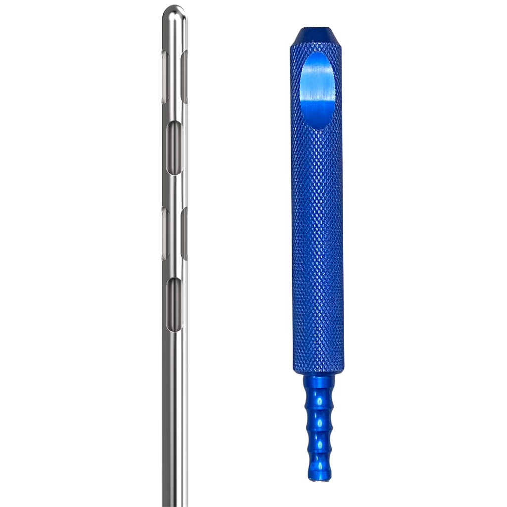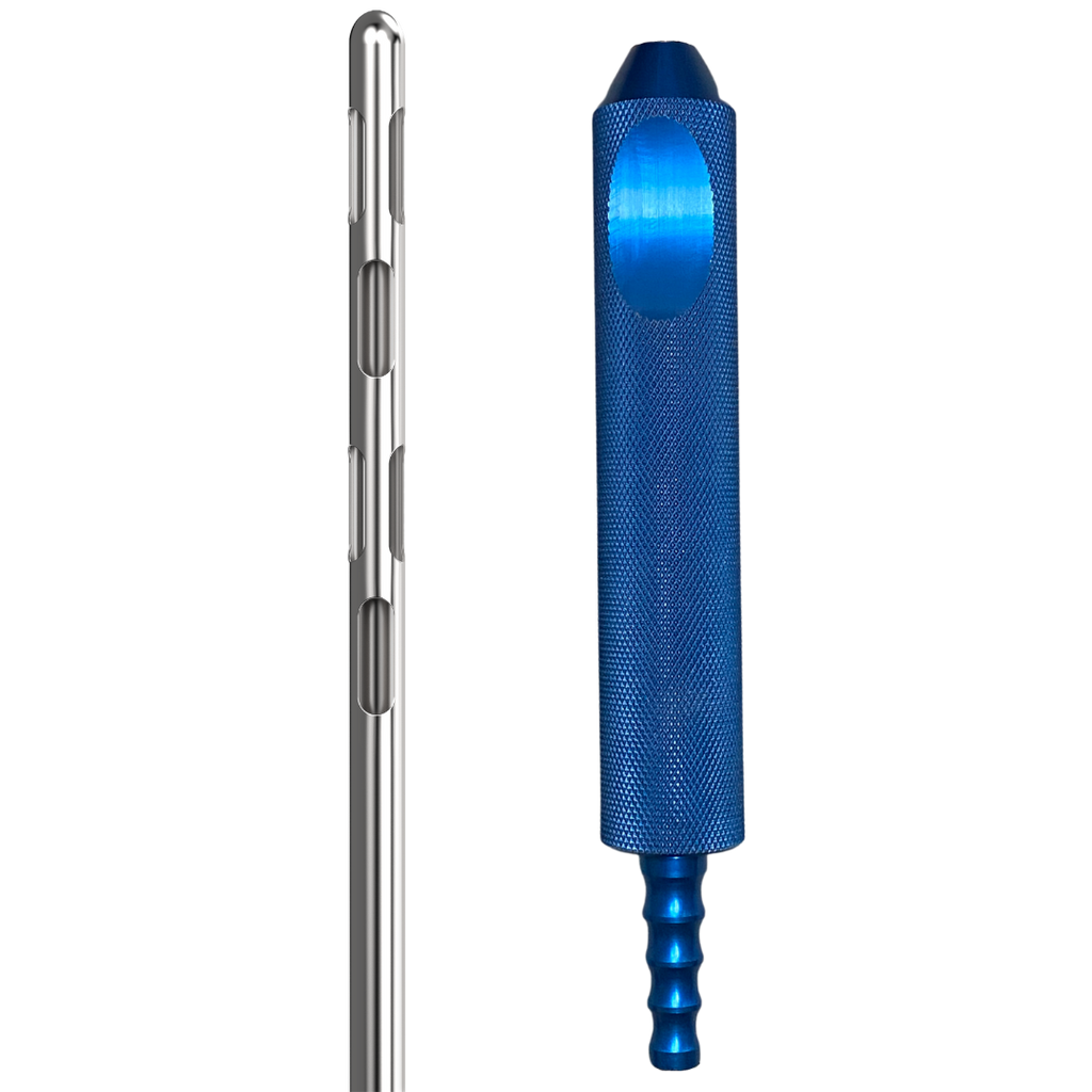 The Lotus formed or knurled aluminum handle option is available in either a 1" or 3/4" diameter. In addition, the Toomey 60cc Blue Aluminum Oversized Hubs have been crafted to give an optimal fit to the syringe whilst guaranteeing the finest performance and reliability. In addition, this cannula is also offered with a large luer-lock stainless steel hexagon hub or a 7/8" QuickScrew hub guaranteeing improved connections for a steady and uninterrupted flow of tissue.